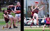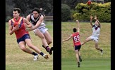 A grinning Emilio Bitters with Lachie Riley (53) and Dino Karamoshos; Lachie Treverton (30) takes a strong mark, Round 3 v St Bede's Mentone Tigers at Brindisi St