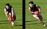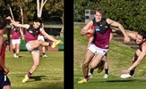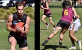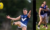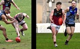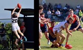 Noah Higgins with a lookaway handball and Hugo Nosiara preparing to kick