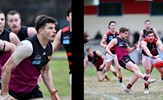 James Connell bends and collects; Charlie Sinclair intently watching the outcome of his pass to Charlie Harrop