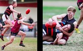 Jayce Morgan (13) marks strongly and Flynn Gregor (28) grasps control of the ball