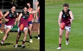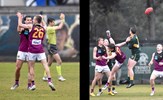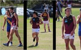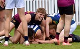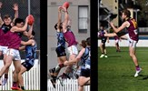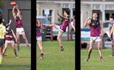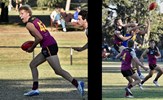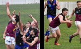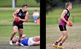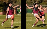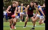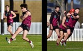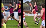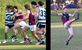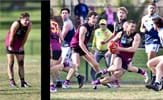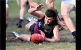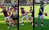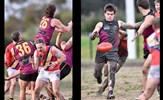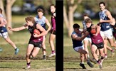Tom Bain broke into the Senior team; forward Jackson Ross juggles the ball over a prone Sam Algeri (4) before kicking one of his five goals for the day