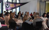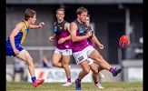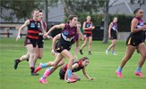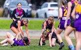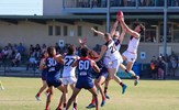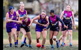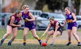 A big pack of players around Sarah Allingham handballing out towards Carly Dillon in the foreground; backing Sarah up are Hannah Pastore and Taylah Vines-Chapple, while Zoe Preston is at the far left and Carla Hewitt far right