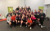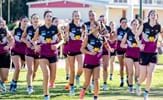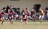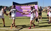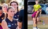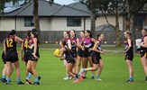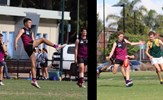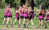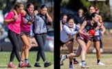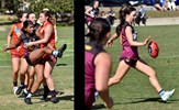 The joy of kicking goals; Jordan Shanks and Taylah Vines-Chapple embrace while Serene Vudiniabola and Kathryn Spencer share a quiet high five in the background