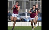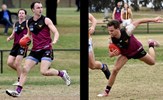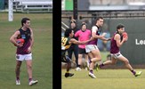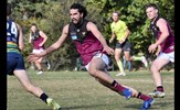 Dino Karamoshos (11) on the run, Nick Gooda ahead in support