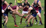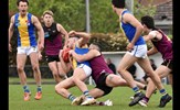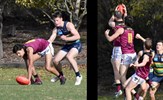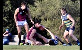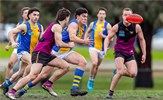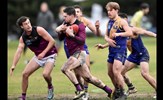Jack Bell kicks clear of an attentive Brede Seccull; Josh Gasparini brings his Uinversity opponent to ground as Lachie Treverton joins in
