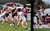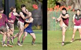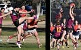 Ben Hood in Reserves ruck action before Durras Seccull (14) stretches for a mark in the Senior game with older brother Brede in the background