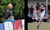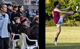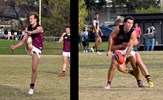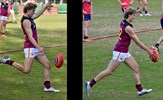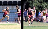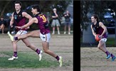 Lorenzo Venturi in the Reserves' Round 14 match against Beaumaris, which turned out to be the final game of the 2021 season before Covid lockdowns spelled the end; at right assistant coach Shane Valenti keeps his hand in