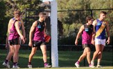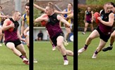 Josh Docking kicks under the watchful eyes of Flynn Gregor and the injured duo of ruckman Jack Bell and forward Lachie Vaughan; a determined looking Peter Gleadhill on his return to the Senior side