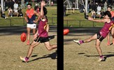 Durras Seccull kicks for goal and awaits the outcome