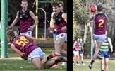 Cooper Nolan clears from the boundary for the Reserves; Durras Seccull on his knees feeding out to Aaron Toy
