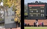 Billy Mackay clears late in the game watched by Durras Seccull and Rohan Heasley; the University Oval scoreboard shows a rare win to the Bloods, only their second ever at the venue and the first since 1991