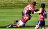 Rookie Flynn Gregor lays a strong tackle in his second senior game; Dre Stefanakis had an eventful 50th game for the club including a season high 7 goals despite being sent off earlier in the game