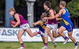 Josh Gasparini about to pick the ball up supported by Jackson Ross; Sam Loewe spoils with Lachie Treverton approaching