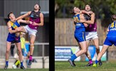 Jack Grenda and Liam Wood (17) battle it out in the Reserves match against St Bernard's at the Snakepit in Round 17
