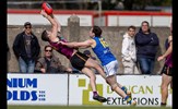 Hugo Lynch with the ball on a string and a close checking James Paul