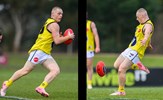 Harry Whitty leans back on a kick, Aaron Toy all eyes on the ball