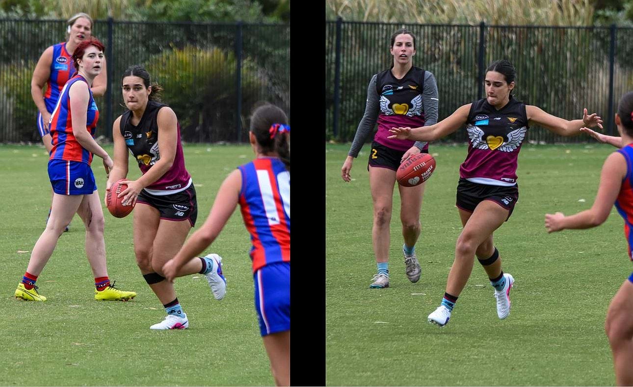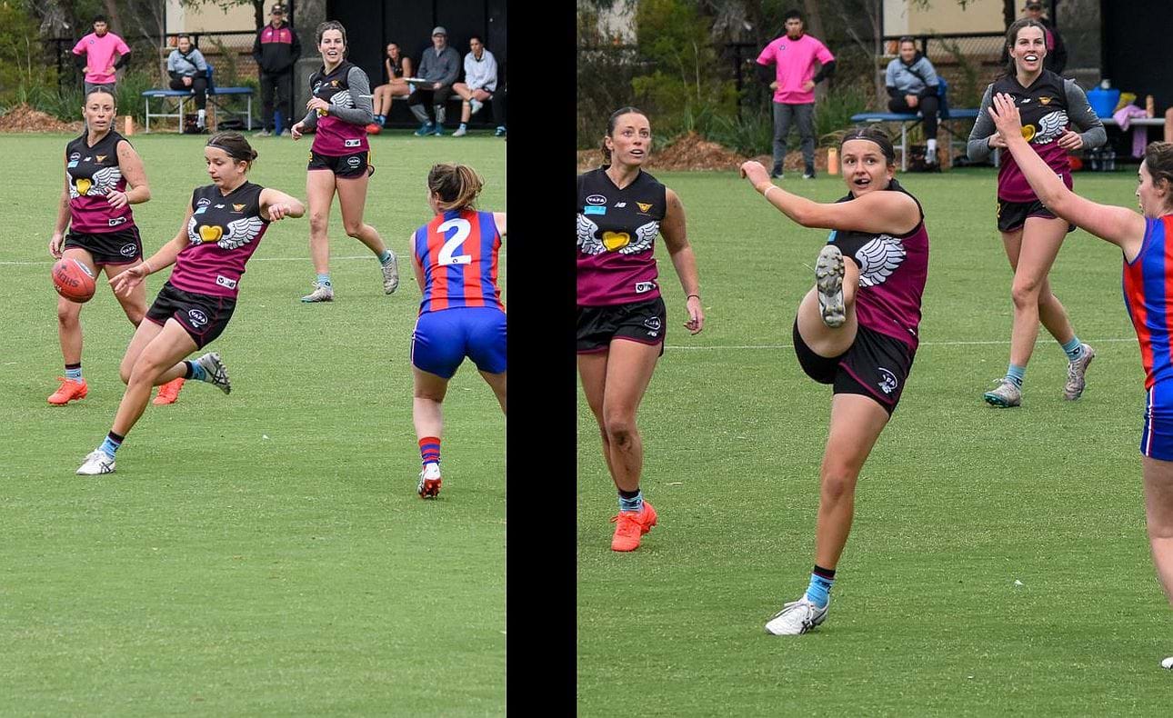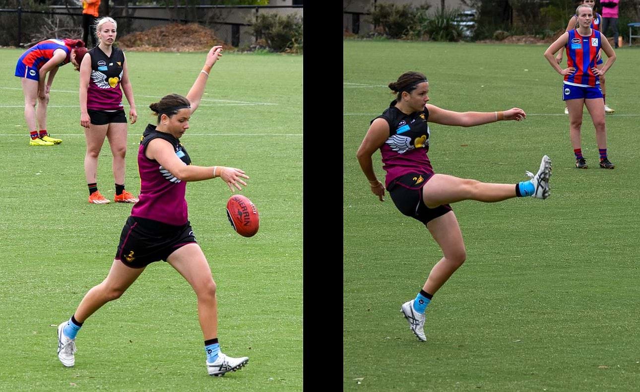 Kicking away are Pulli Gardiyawasam and Leesa Guastella